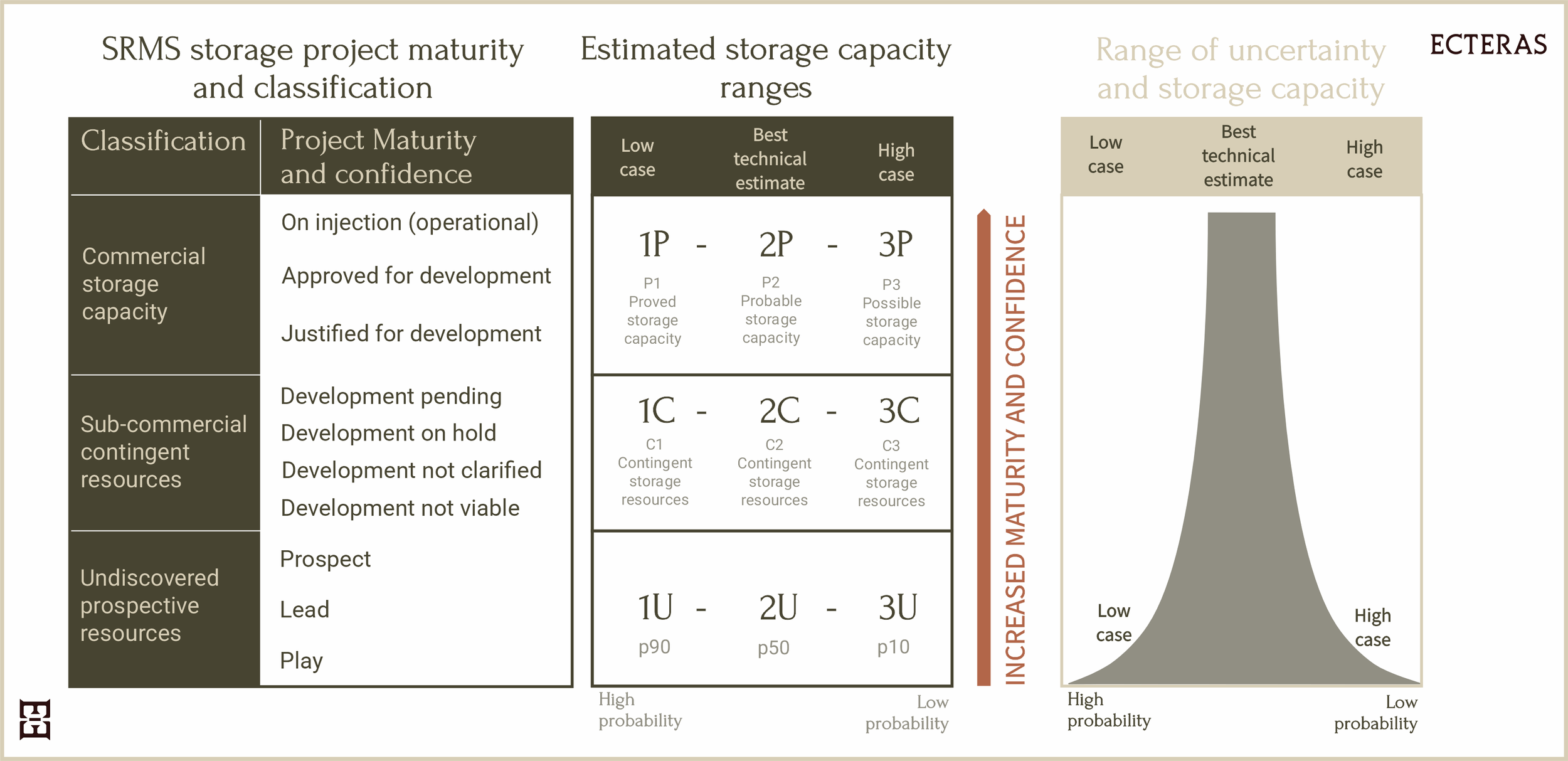 SRMS classification system representing technical project maturity and uncertainty in storage capacity estimate ranges. It is in the early and immature stages that storage capacity ranges change the most. Note that economics is not included.