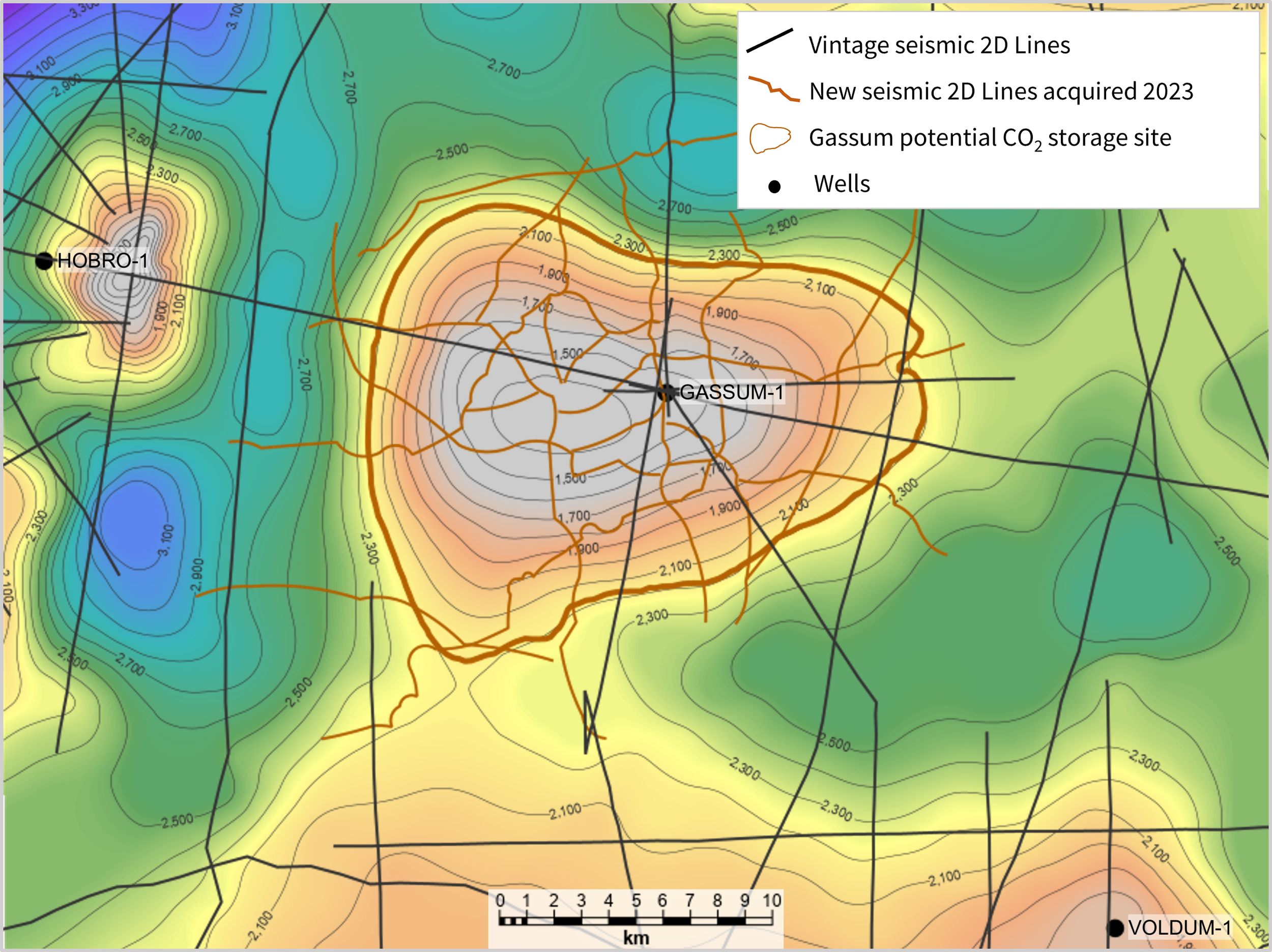 For the map below, note that the vintage seismic lines that were available for the Gassum Site structure back in 2023 are marked in black, which is why the structure may change shape when the new seismic data is integrated. Those new 2D seismic lines have are shown in orange. Also note that the new seismic lines follow the roads in the area, which is a limiting factor when acquiring seismic data onshore in populated areas.